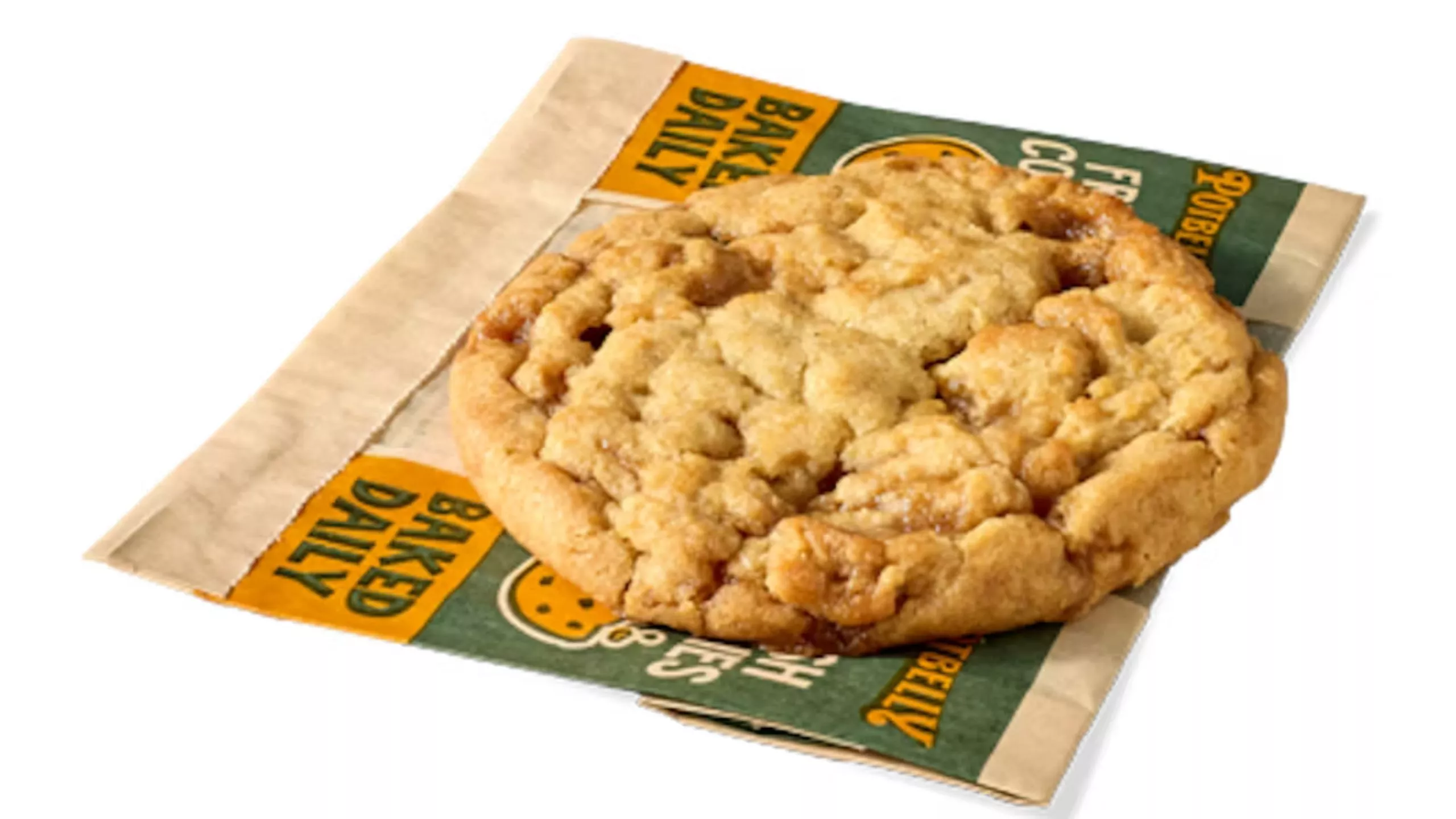 The Toffee Butter Brickle Cookie from Potbelly Sandwich Shop is soft and sweet. It has a buttery taste and small, crunchy toffee pieces inside. These toffee bits add a light caramel flavour and a little crunch to every bite.